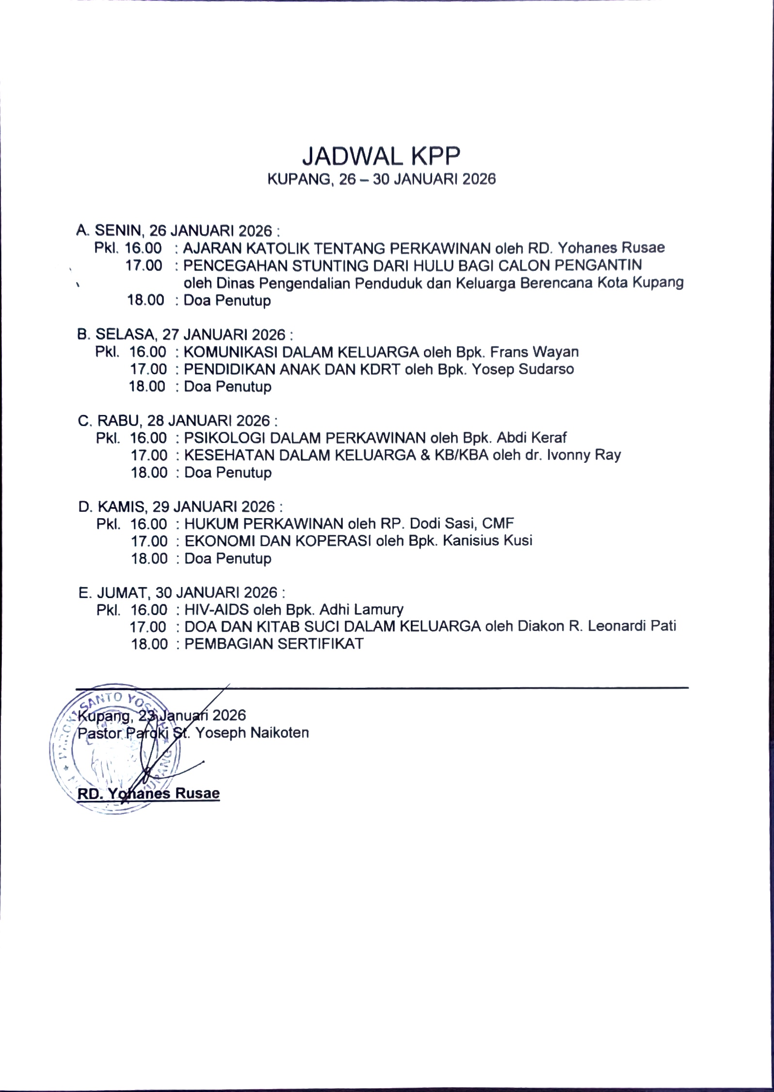 | 1 | Kursus Persiapan Perkawinan (Download Jadwal KPP) | 26 Januari 2026 – 30 Januari 2026 | Tempat : Aula P.Blasius Fernandez,SVD |