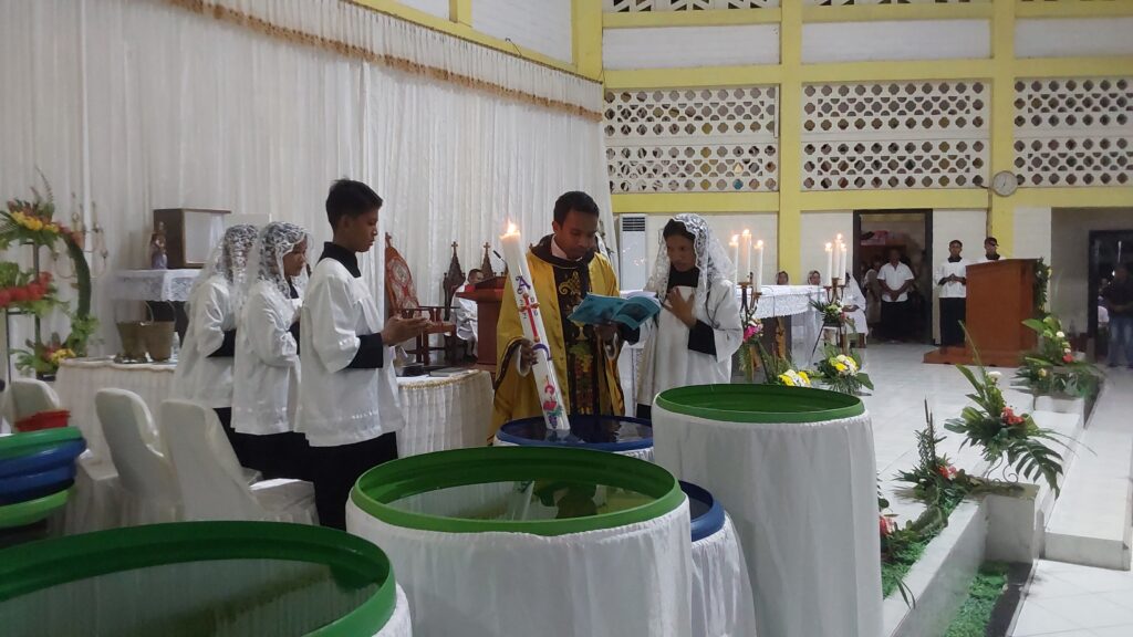 Setelah homili dirayakan Liturgi Baptis. Ada 3 katekumen yang dibaptis pada malam Paskah ini dan ada 13 orang yang menerima komuni pertama.