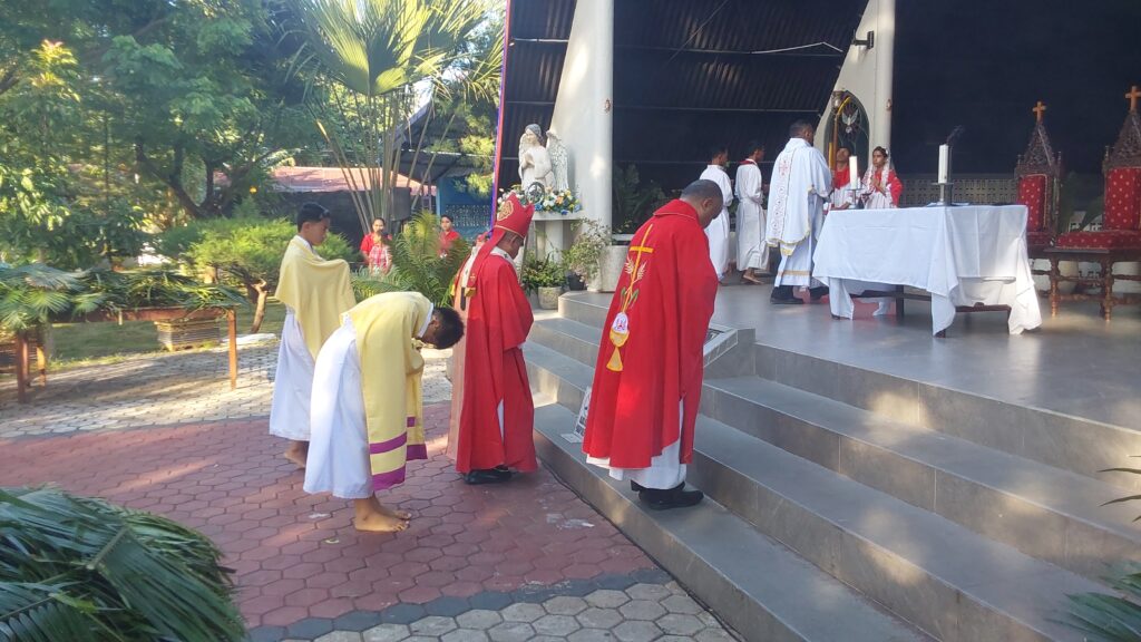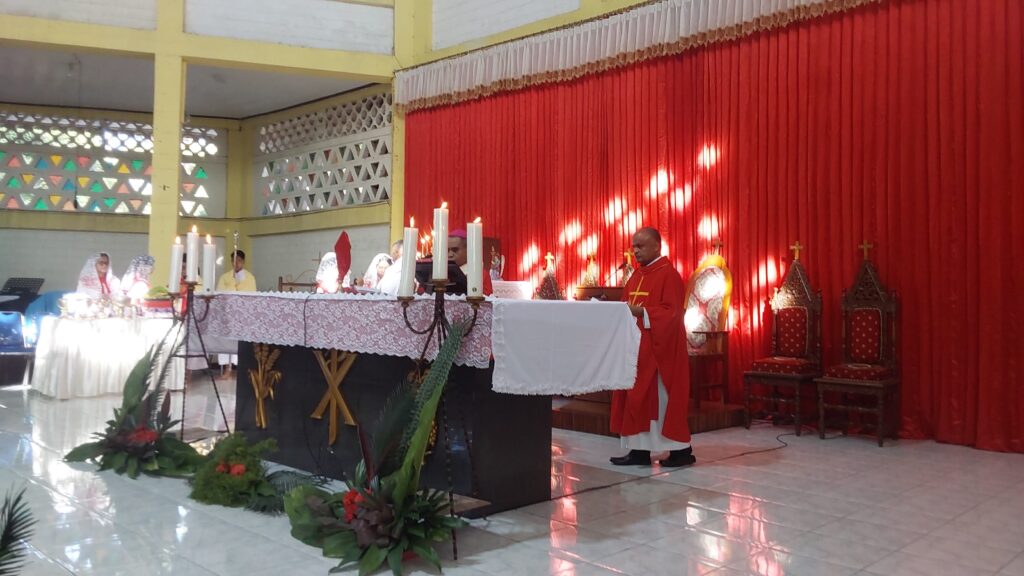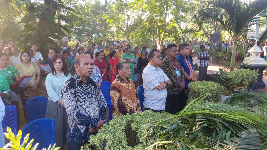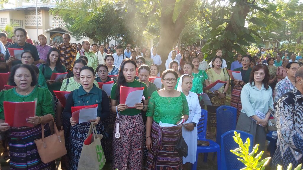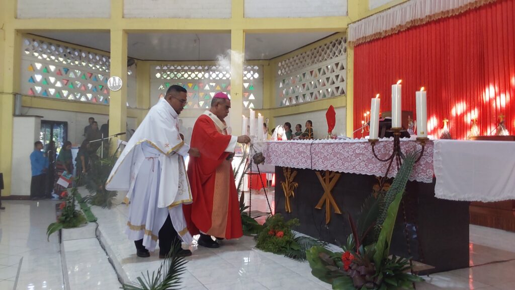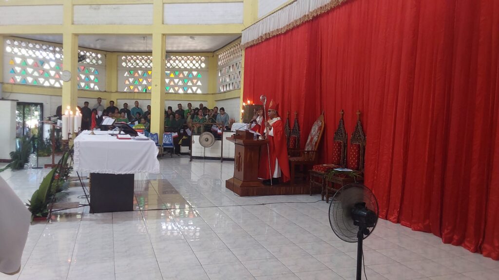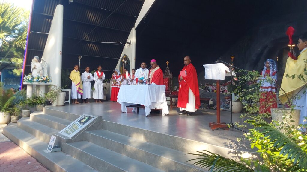 Perayaan Misa Pkl. 07.00 WITA dipimpin oleh Uskup Agung Kupang, Mgr. Hironimus Pakaenoni didampingi RD Jhon Rusae dan Diakon Redemptus Leonardi. Misa ini dihadiri oleh Gubernur Nusa Tenggara Timur, Melki Lakalena serta ribuan umat yang memenuhi area gereja hingga ke tenda-tenda yang disiapkan di luar gedung gereja, diiringi Paduan Suara dari Wilayah VII.