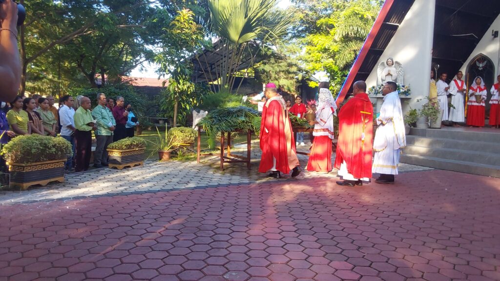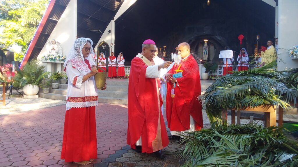 Rangkaian perayaan diawali dengan perarakan Minggu Palem yang dimulai dari Taman Doa Maria Immaculata. Dalam homili singkat sebelum perarakan, Uskup Hironimus merefleksikan kisah Yesus yang meminjam seekor keledai untuk memasuki Yerusalem. Uskup Hironimus menekankan bahwa setiap orang memiliki karunia dan talenta yang dapat diserahkan kepada Tuhan, “Masing-masing kita memiliki karunia dan talenta yg bisa diserahkan kepada Tuhan. Tuhan memerlukannya!”